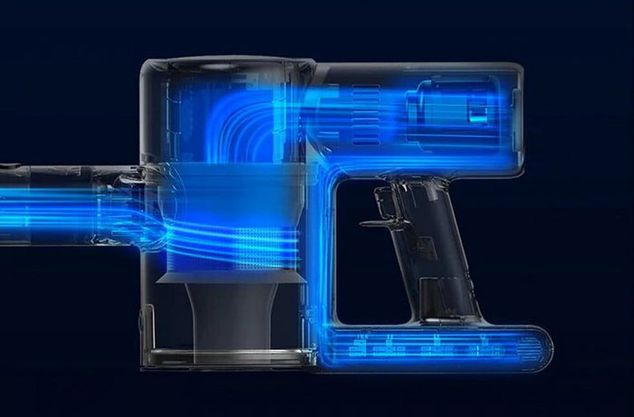 Ручной беспроводной пылесос Dreame V10 Boreas Vacuum Cleaner. Устройство получило уникальный мотор. Ротор двигателя достигает 100 тысяч оборотов в минуту, что позволяет Dreame V10 всасывать мусор с мощностью 140 AW и 22000 Па. Чтобы достичь таких показателей, в компании Xiaomi разработали особую каркасную систему, которая помогает компенсировать любую возможную возникающую центробежную силу. Поскольку пылесос развивает высокую мощность, для предотвращения перегрева двигателя, ему требуется охладительная система.