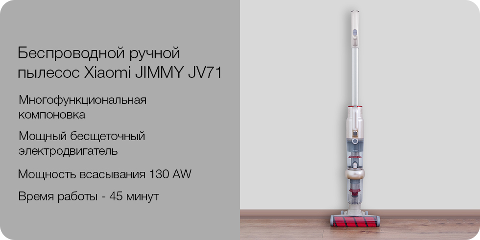 Пылесос Jimmy JV71 оснащен бесщеточным электродвигателем нового поколения, работающим со скоростью 100'000 об/мин. Его непревзойдённая производительность обеспечивает мощную силу всасывания в 130 AW. Инновационная вертикальная компоновка элементов со сниженным центром тяжести помогает экономить силы и реализовать множество удивительных функций в одном корпусе.