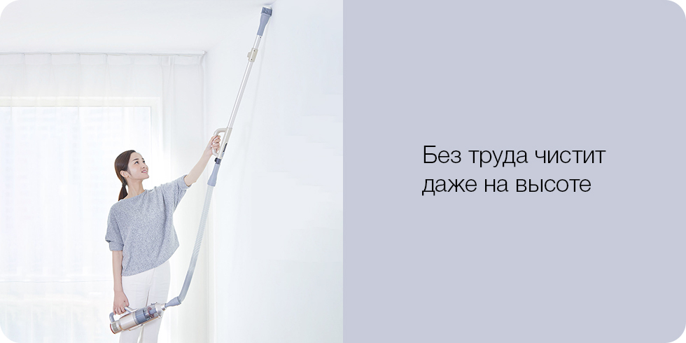 При уборке высоких мест можно воспользоваться идущим в комплекте шлангом. Достаточно лишь поднять руку, чтобы очистить от пыли возвышенные поверхности, например, потолок. Сам двигатель при этом может остаться на земле или в руках, чтобы Вы не тратили силы попусту.