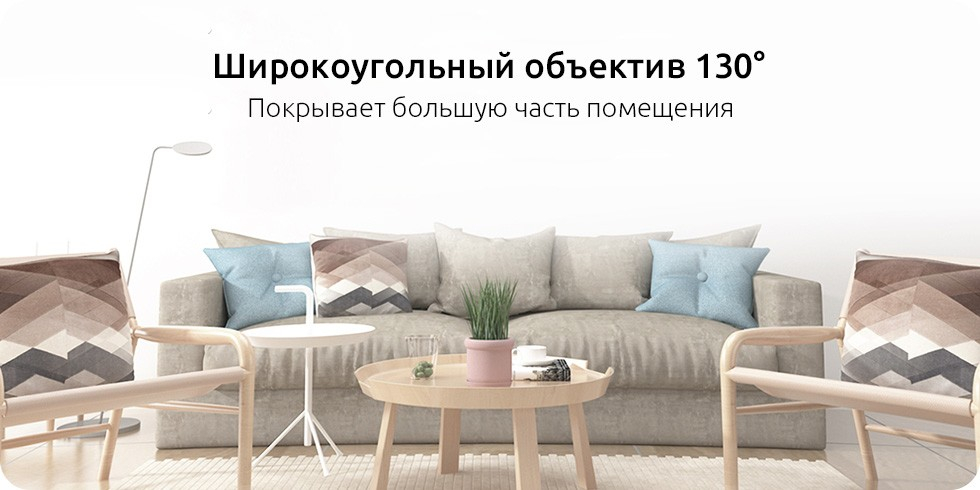 Со сверхширокоугольным объективом с углом поля зрения 130°, который установлен в камере, Вы сможете увидеть всё пространство помещения с минимальным количеством слепых зон.